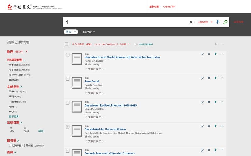 CASHL平台整合的印本图书和电子图书面向全国高校读者提供统一检索、馆际互借和部分章节传递的文献共享服务,印本图书涵盖了国内70余所高校图书馆和上海图书馆的357.6万种;电子图书涵盖了17所高校图书馆的299.3万种。学科涉及文学、艺术、历史、考古、哲学、政治、军事、经济、法学、教育学、社会学、新闻传播、管理学、心理学、图书情报文献学、语言学、区域研究等。我校读者可在校园网内直接点击检索结果浏览或下载全文。