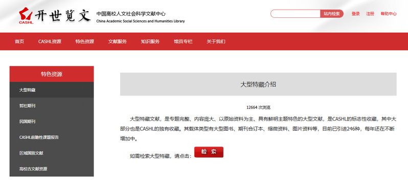 CASHL特色资源包括大型特藏、哲社期刊、民国期刊、CASHL前瞻性课题报告、区域国别文献、高校古文献资源。