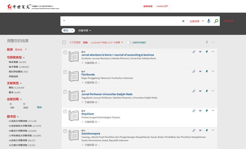 CASHL全部数据库是CASHL平台上集成的900多个CASHL中心馆人文社科类数据库,涉及文学、艺术、历史、考古、哲学、政治、军事、经济、法学、教育学、社会学、新闻传播、管理学、心理学、图书情报文献学、语言学、区域研究等全部人文社会科学学科,以及各类交叉学科;文献类型包括图书、期刊、学位论文、音像、乐谱、地图等20多种文献类型。有访问权限的院校,可在校园网内直接点击检索结果浏览或下载全文、收听或观看音像。