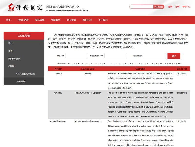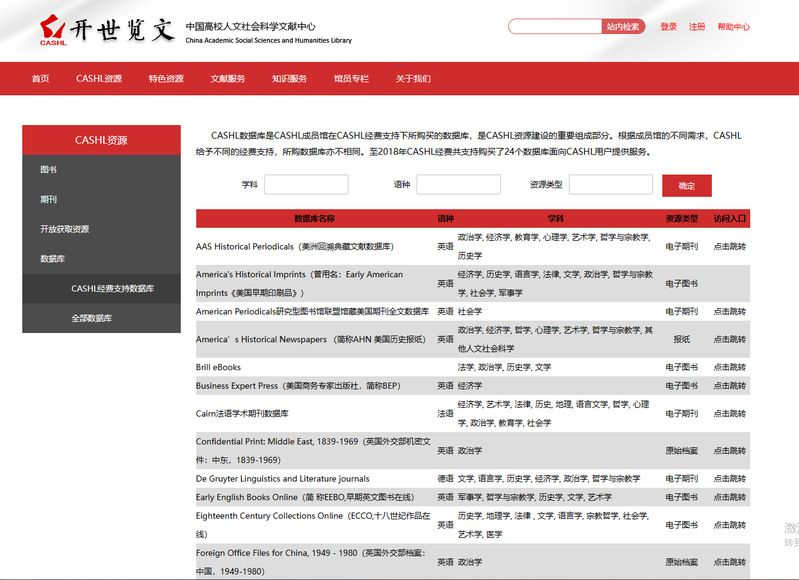 CASHL数据库资源包括:CASHL经费支持数据库和全部数据库资源。