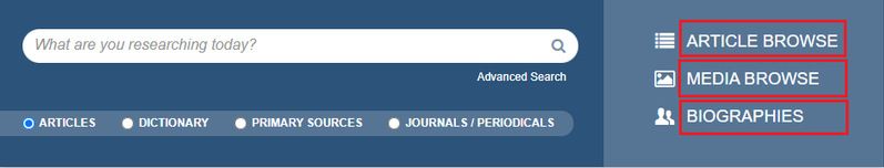 读者也可以在执行检索以后,通过左侧菜单内的图标,按类型筛选检索结果,例如⽂章(ARTICLES)、图像(IMAGES)、视频(VIDEOS)、词典(DICTIONARY)、期刊杂志(JOURNALS/PERIODICALS)、原始⽂献与电⼦书(PRIMARY SOURCES/E-BOOKS)或年鉴(YEAR IN REVIEW)。