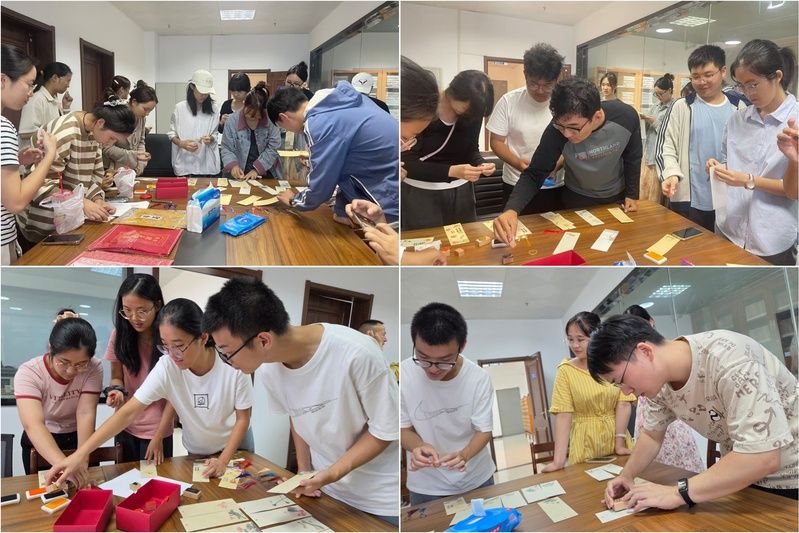在活动互动体验环节,古籍馆精心准备了国风雅韵书签、有趣的典籍元素印章以及馆藏珍贵古籍《硃批谕旨》同款文创纪念品。最受新生欢迎的当属“中秋”“月饼”“花好月圆”“多喜乐常安宁”“长乐未央”“欢喜”“如意”等多款特色印章,新生们积极创作,有序盖章,在书签上亲笔书写自己喜欢的诗词,将传统文化元素“带回家”。不少新生还主动分享创作成果,或在社交平台记录这场特别的文化体验。工商学院的陈同学兴奋地说:“原来从课本里学到的古籍,现在真的能看到实物,这种感觉太奇妙了!”经济学院的史博士感慨“听说学校有一个珍藏着各类古籍的知识宝库,很幸运有机会能在开放日进入古籍馆,以后写论文、查古籍,有了数字化平台的助力,线上就能搞定,切实提升了研究工作的便捷性,很赞!”