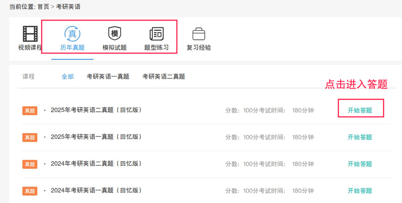 选定考试类型后,可以根据需要选择历年真题、模拟试题和专项题型练习三种训练模式。