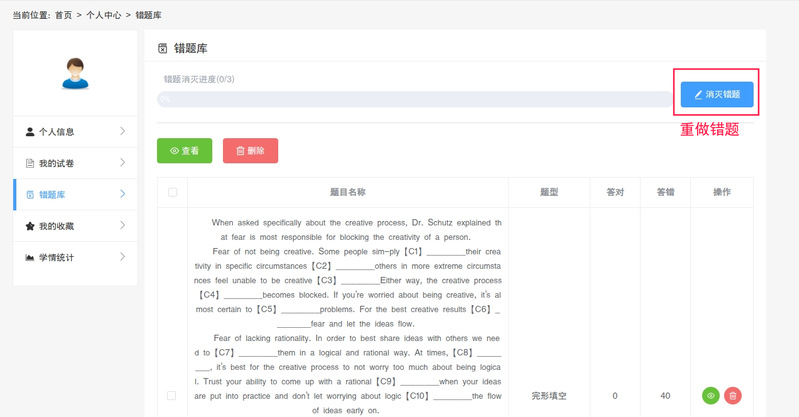 个人中心可查看已经作答过的试卷和错题,便于用户随时记录学习轨迹,并重点复习错题对应的知识点。