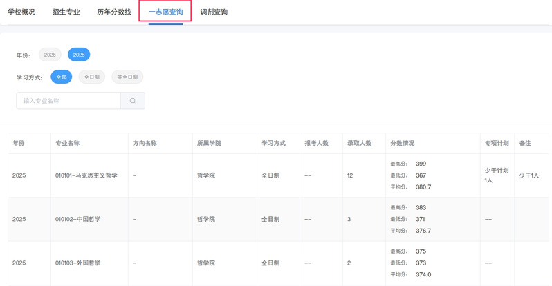 在院校界面还可以进一步查询各专业的一志愿分数线和调剂人数及分数线情况,为用户规划备考提供参考。