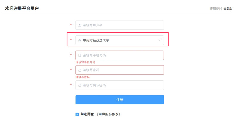 首次登录起点考试网的同学,需要先注册个人账号,注册时将机构选为“中南财经政法大学”,并填写手机号完成注册,注册成功后即可进行访问学习。