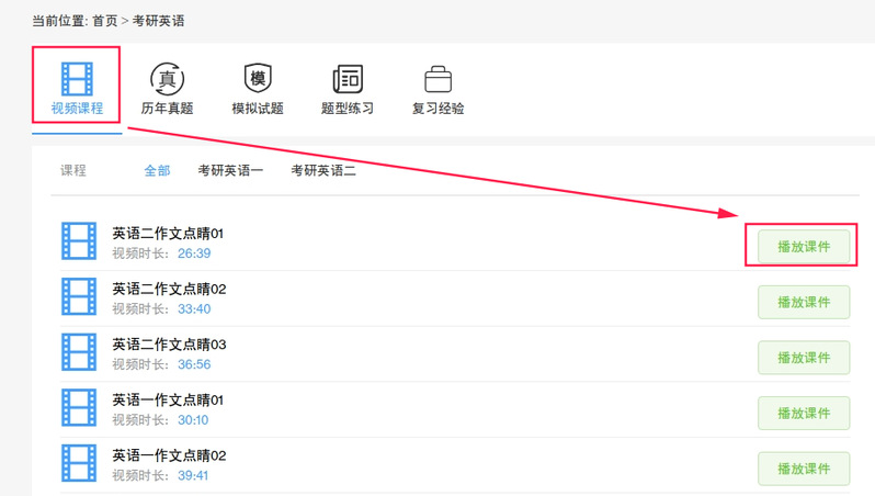 在起点考试网首页导航栏中选择考试名称,可进入该考试的专题课程列表,选择需要学习的课程,点击课程名称或“播放课件”开始在线学习。