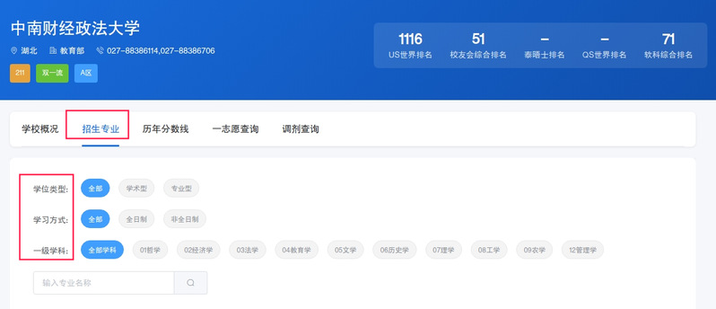 院校库中可以查看该年招生的全部院校信息,还可以按照院校的地区、学科类型等进行筛选。