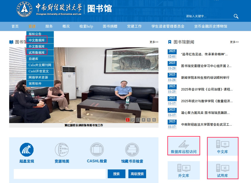 数据库访问方式:在校园网环境下,点击图书馆主页上方导航栏“资源”→“中文数据库”或“试用数据库”,或者点击图书馆主页右下方“中文库”或“试用库”;在非校园网环境下,点击图书馆主页右下方“数据库远程访问”后进行统一身份认证,就可以在中文数据库及试用数据库列表中按照数据库名称找到相应数据库。