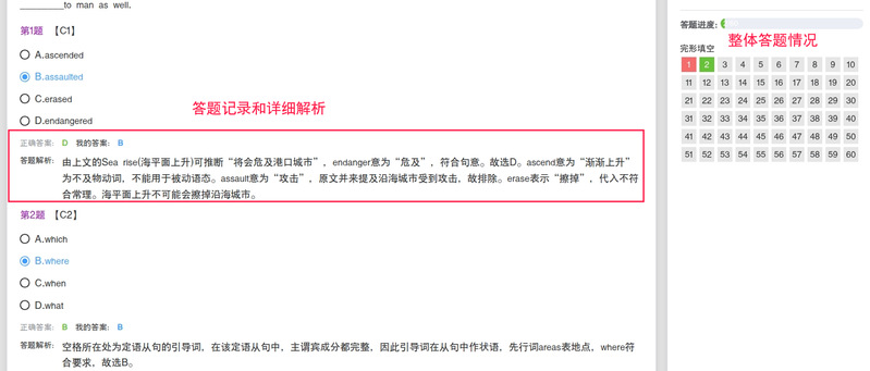 答题界面各功能分区如下图所示,用户可以直接在网页上作答,或将试题导出为word格式,完成后再将答案填入系统中交卷。交卷后可详细查看每道题目的得分情况和详细解析。
