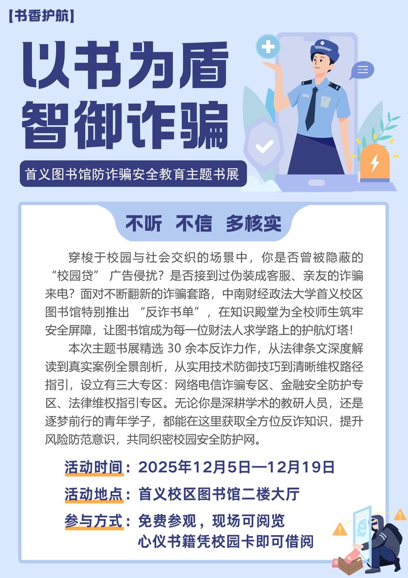 穿梭于校园与社会交织的场景中,你是否曾被隐蔽的“校园贷” 广告侵扰?是否接到过伪装成客服、亲友的诈骗来电?面对不断翻新的诈骗套路,中南财经政法大学首义校区图书馆特别推出“反诈书单”,在知识殿堂为全校师生筑牢安全屏障,让图书馆成为每一位财法人求学路上的护航灯塔!