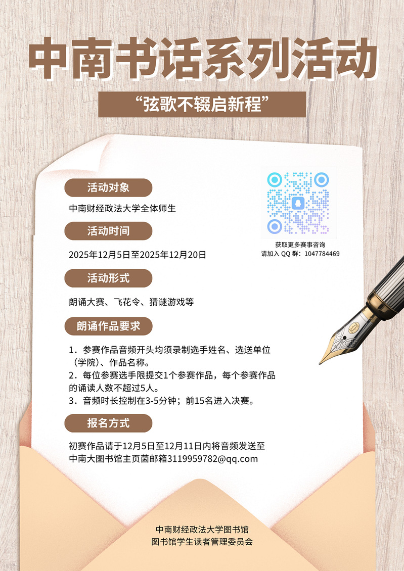“弦歌逐光润中南,朗韵传声赴新程”,为回望峥嵘岁月、擘画文化新篇,彰显文字力量与青年担当,特举办中南书话系列活动。以诵读为桥,交融语言与文字之美;以青年为翼,传递文化薪火与时代心声,让书香浸润校园,让思想点亮征程。具体事宜如下: