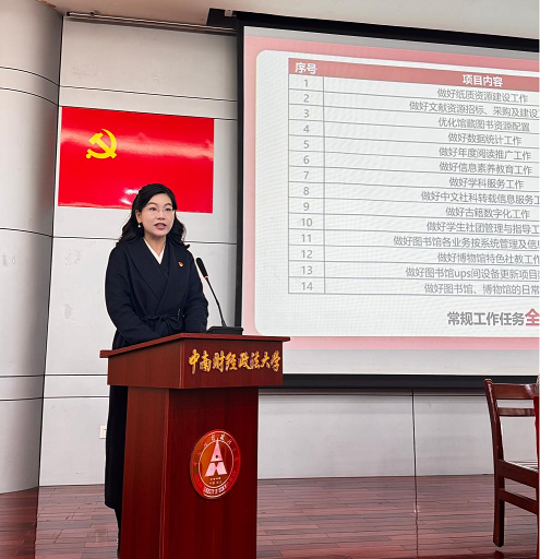 杨小玲副馆长围绕学科服务、信息素养教育、信息化建设、阅读推广等分管工作,明晰任务分工、细化落实举措,明确核心改革创新任务:聚焦数字化转型,推动信息素养教育向数字素养教育全面升级,构建深度学科服务与素养育人体系;同步部署三项重点工作:一是推进学科服务精准化系统化,建立常态化学院走访机制,提供深度学科知识服务;二是升级电子资源远程访问系统与图书馆官网版式,夯实信息化服务根基;三是深耕品牌阅读推广活动,营造爱读书、读好书、善读书的浓厚校园氛围。她还着重强调,各部门要抓实安全管理,常态化开展安全巡察,层层压实安全责任,筑牢全馆安全防线。
