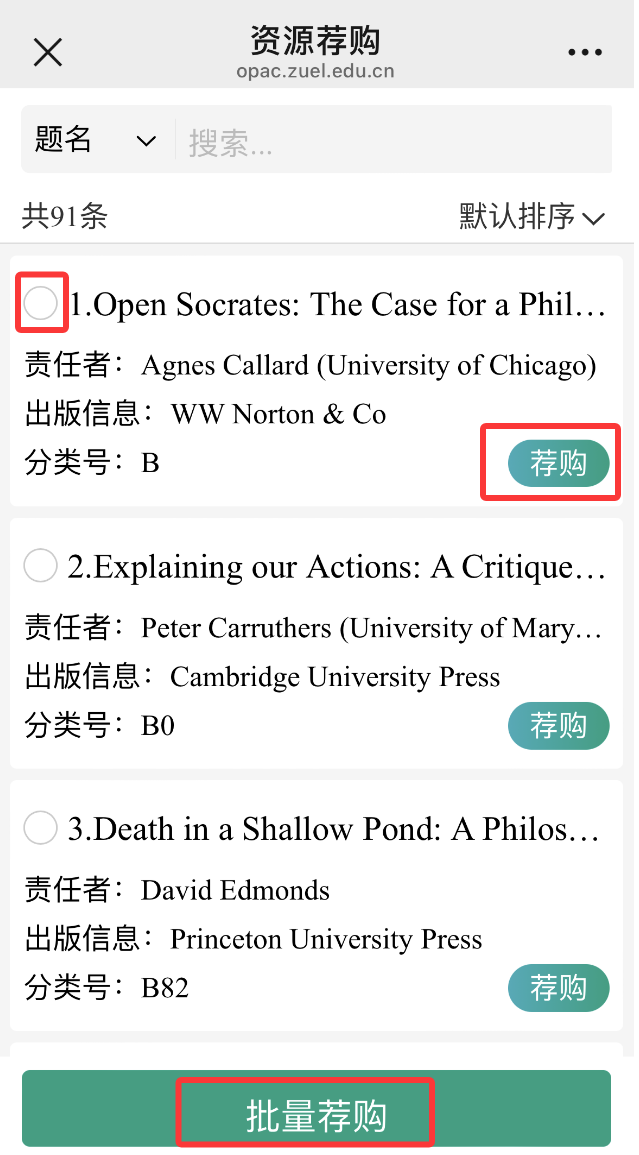 三、进入书单后,您可以看到本期荐购的全部书单,点击图书序号前的小圆圈可选中该本图书,点击右侧“荐购”按钮即可提交;若您有多本图书需要荐购,可全部选中后点击下方“批量荐购”。
