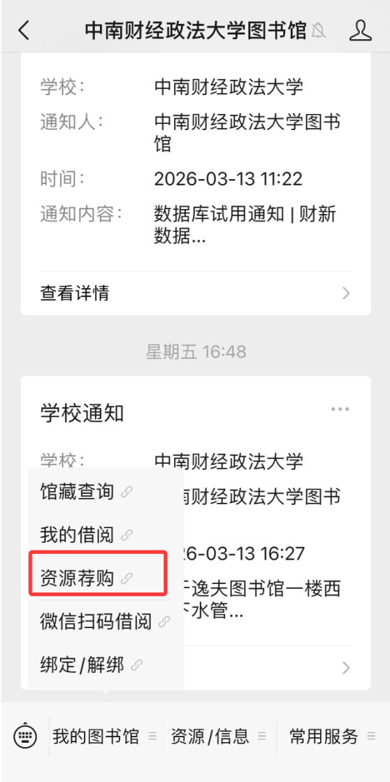 一、进入中南财经政法大学图书馆微信公众号,点击左下角“我的图书馆”按钮,继续点击“资源荐购”;