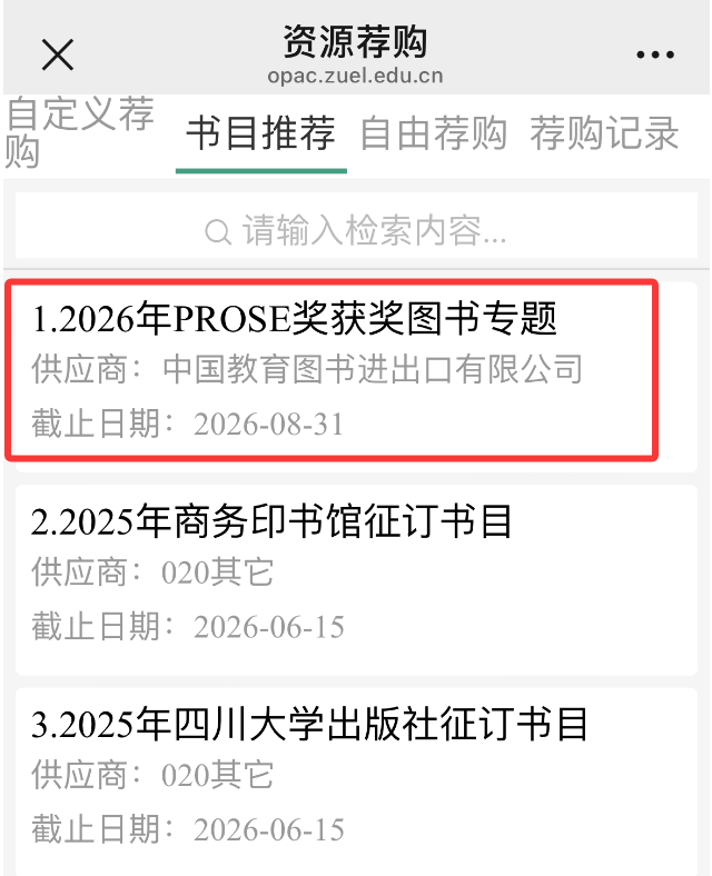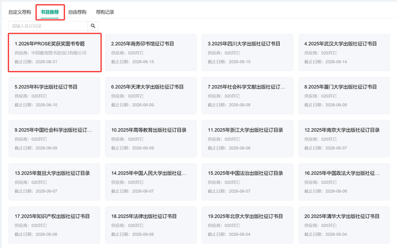 四、选择“书目荐购”,点击进入“2026年PROSE奖获奖图书专题”;