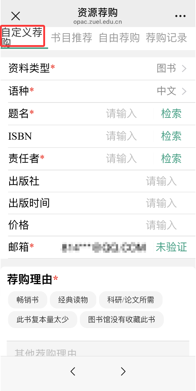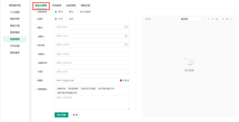 六、针对书单外需求,可点击“自定义荐购”,填写图书相关信息提交即可。