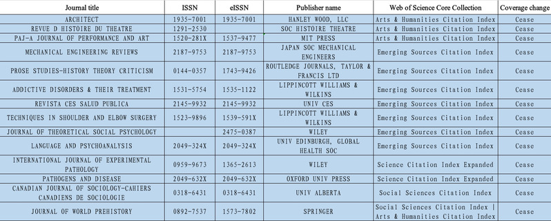 共有14本期刊被停止收录,其中A&HCI期刊4本,ESCI期刊7本,SSCI期刊2本,SCIE期刊2本。其中,《JOURNAL OF WORLD PREHISTORY》期刊曾同时收录于SSCI及A&HCI。