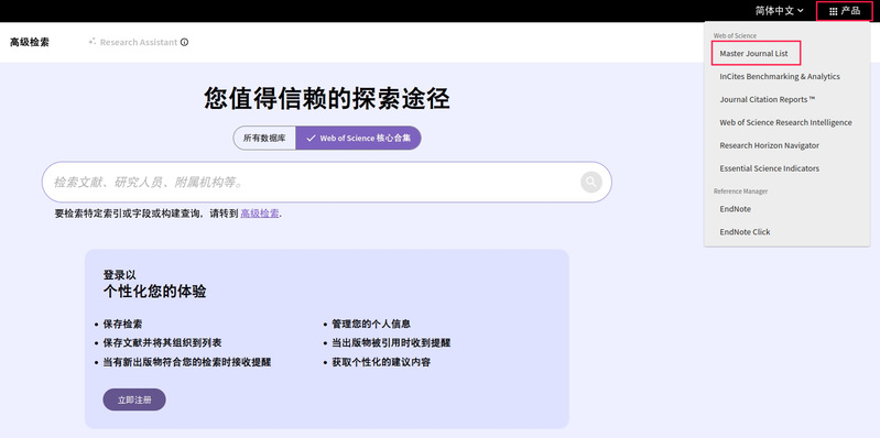 1. 从图书馆首页—外文库进入Web of Science核心合集数据库,点击首页右上角产品,选择Master Journal List;