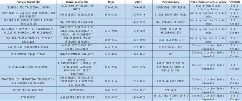 共有11本期刊进行更名或期刊合并,其中1本属于A&HCI,4本属于ESCI期刊,6本属于SCIE期刊。期刊更名后,需要在文献检索、引用及投稿时使用更新后的刊名。