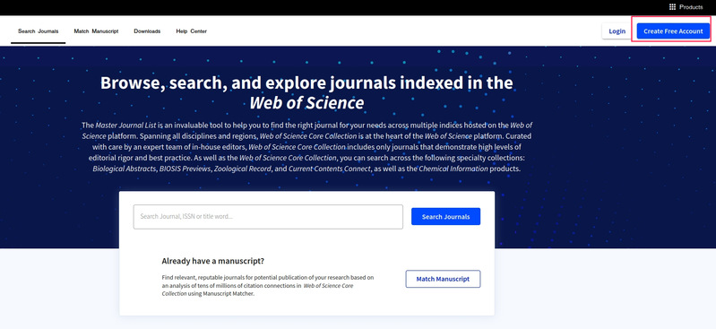 2. 如需使用Master Journal List的全部功能,需要先注册个人账号。点击右上角Create Free Account填写个人基本信息后即可完成注册。