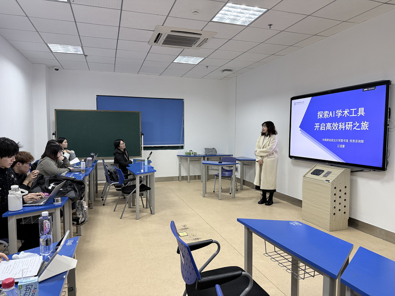 (通讯员 黄佳鑫)2026年3月16日下午,应外国语学院李晶老师邀请,图书馆信息咨询部江语蒙老师在文澴楼208教室为外国语学院研究生带来了《AI赋能外语学术论文写作》课程的嵌入式教学。江老师围绕与课程相关的“文学的叙事伦理”等主题,介绍了AI学术工具、提示词的构建、AI工具使用的注意事项等内容。