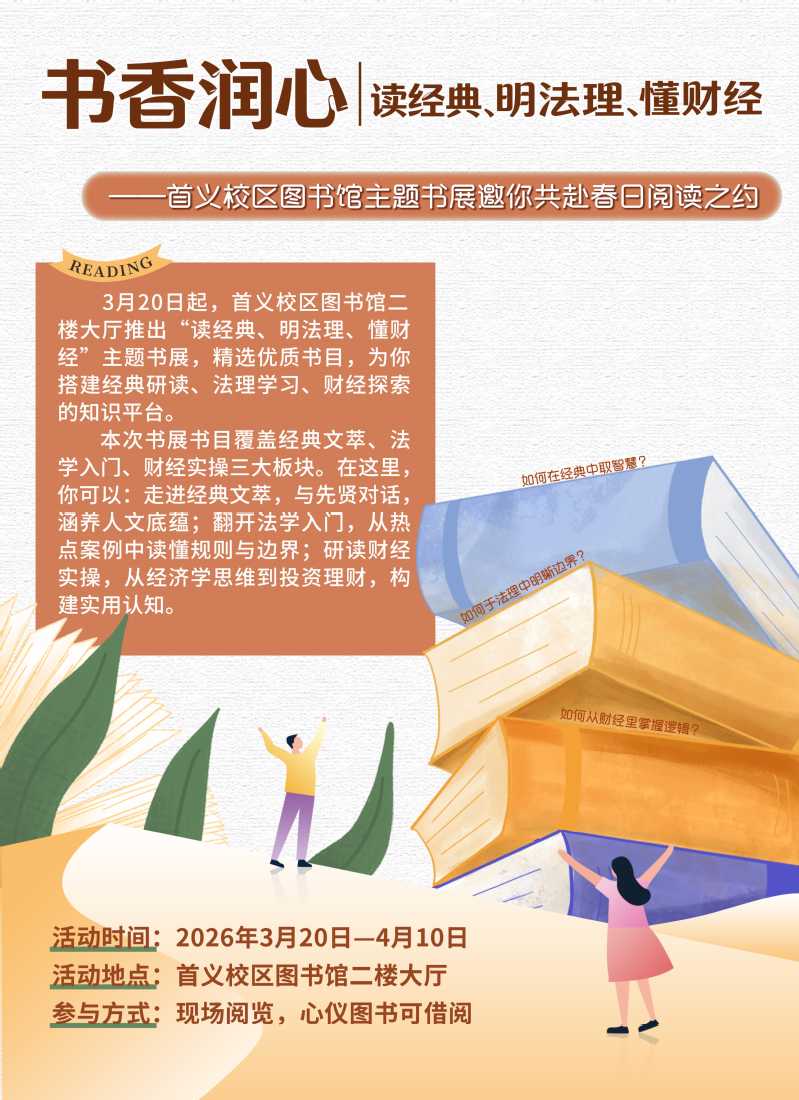 3月20日起,首义校区图书馆二楼大厅推出“读经典、明法理、懂财经”主题书展,精选优质书目,为你搭建经典研读、法理学习、财经探索的知识平台。