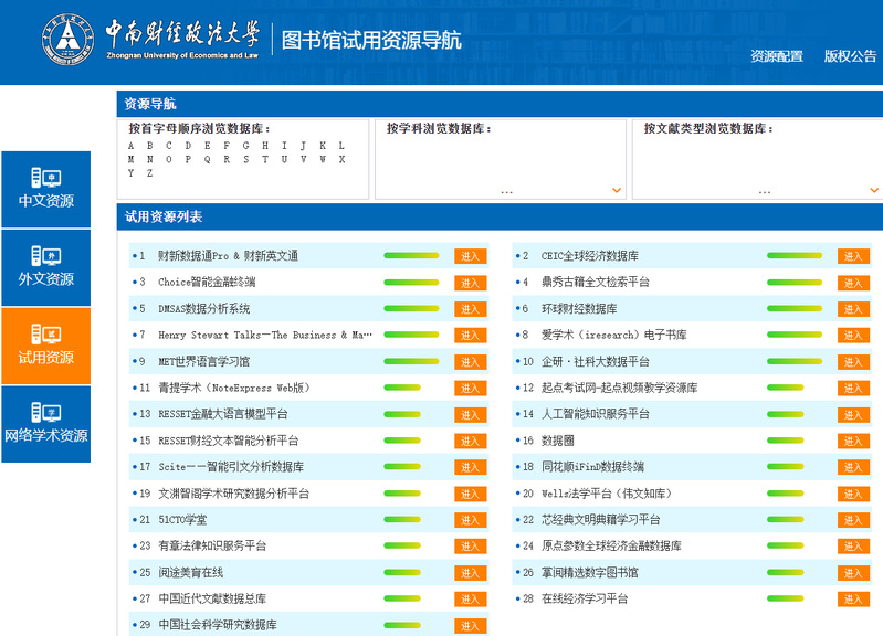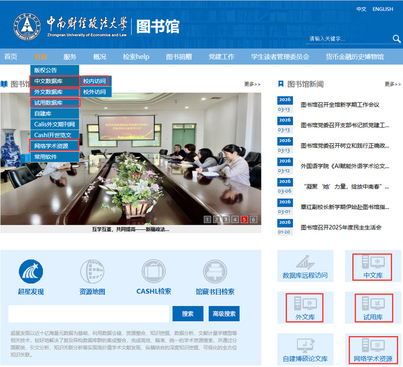 ②“图书馆官网”——“资源”下拉菜单中的“中文数据库”/“外文数据库”/“试用资源”/“网络学术资源”——“校内访问”