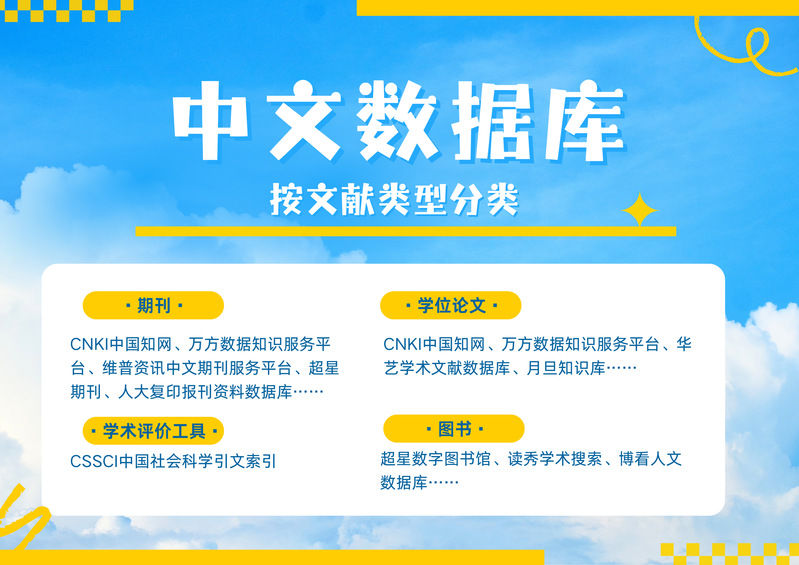文献类型上,读者可通过CNKI中国知网、万方数据知识服务平台、维普资讯中文期刊服务平台、超星期刊、人大复印报刊资料数据库等获取期刊论文;通过CNKI中国知网、万方数据知识服务平台、华艺学术文献数据库、月旦知识库等数据库查阅各类学位论文;依托CSSCI中国社会科学引文索引检索人文社科领域高影响力成果、追踪学术热点;通过超星数字图书馆、读秀学术搜索、博看人文数据库等在线阅读或下载电子图书。