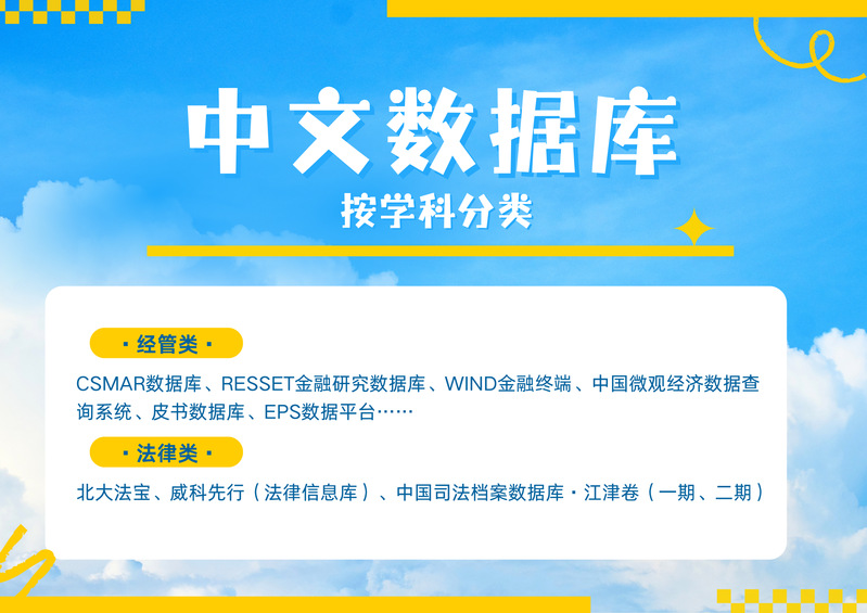 学科适配上,CSMAR数据库、RESSET金融研究数据库、WIND金融终端、中国微观经济数据查询系统、皮书数据库、EPS数据平台等数据库可提供金融、经济、统计等领域的一手实证数据;北大法宝、威科先行(法律信息库)等数据库,则涵盖各类法律法规、司法案例和法律实务等。