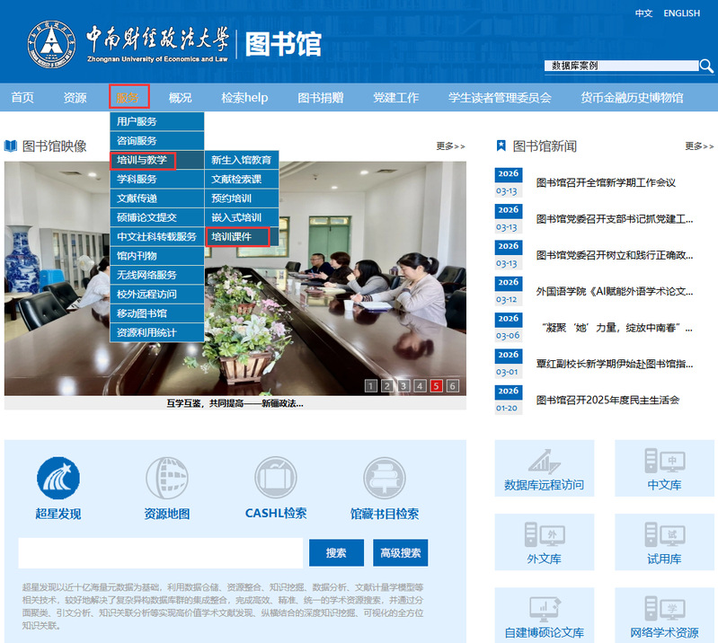 除此之外,上述图书馆在订中外文数据库的详细使用指南可访问图书馆主页→ 服务 → 培训与教学,点击“培训课件”可查看、下载。