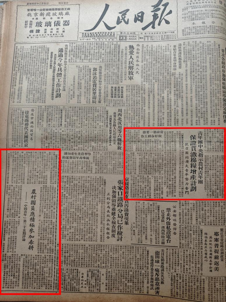 从《农村团员应积极参加春耕》对“抓住农时、积极春耕”的动员,到《青年团中央指示农村青年团保证贯彻棉量增产计划》对增产任务的具体部署,春耕生产受到广泛关注。在广阔的田野,广大青年成为犁开冻土、播撒种子的先行者,将对生活的憧憬深耕进脚下的泥土之中。