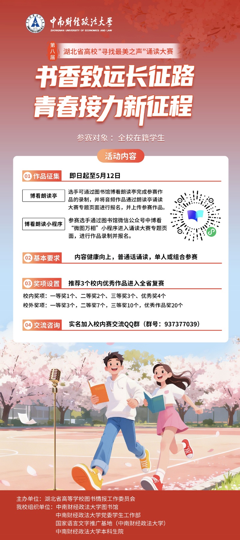 为深入贯彻落实习近平总书记关于推动全民阅读、建设书香中国的重要指示精神,积极响应《全民阅读促进条例》中关于促进全民阅读的部署要求,践行“典耀中华”主题读书行动,在第31个世界读书日暨“全民阅读活动周”来临之际,中南财经政法大学图书馆联合党委学生工作部、国家语言文字推广基地(中南财经政法大学)、本科生院面向全校开展“书香致远长征路 青春接力新征程”暨第八届湖北省高校“寻找最美之声”诵读大赛校内选拔赛。本次大赛旨在献礼红军长征胜利90周年,鼓励广大学子以声音为媒,借助AI技术赋能语言表达,在诵读中重走长征路,于经典中感悟信仰之光,以科技之力书写新时代的青春答卷。