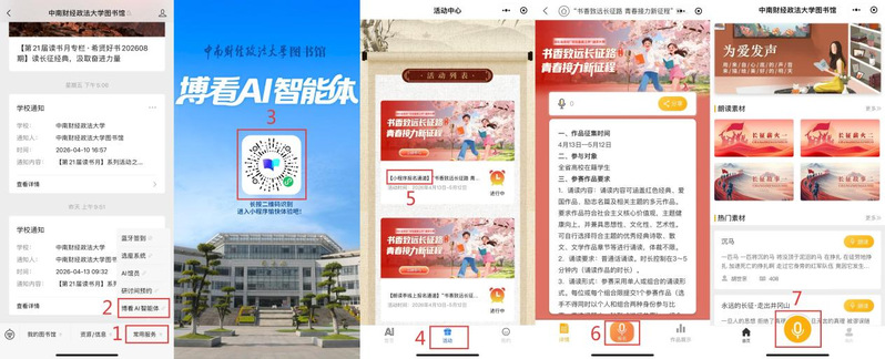 (2)微信端报送:进入“中南财经政法大学图书馆”微信公众号,在底部菜单栏依次选择“常用服务-博看AI智能体”,识别二维码进入“微图万相”小程序,点击小程序底部“活动”菜单栏进入诵读大赛专题页面,进行作品录制并报名。